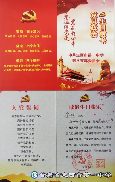 4月12日,定西市第一中學數學黨支部召開了”不忘初心,砥礪前行”暨黨員”政治生日”主題黨日活動,為李坤同志慶祝“政治生日”。