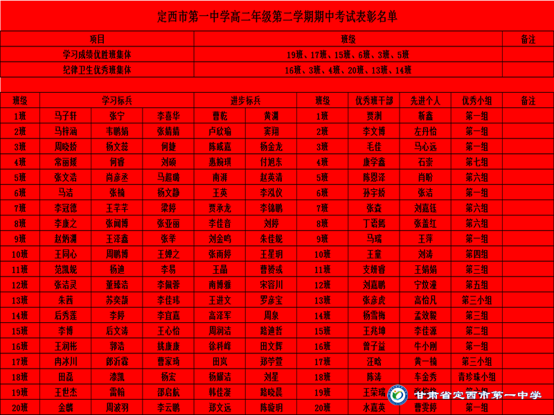 這次大會表彰了高二(19)班等12個優秀班集體,馬子軒、張寧等60名學習標兵,曹乾、黃淵等40名進步標兵,賈洲等20名優秀班干部,靳鑫等20名先進個人。