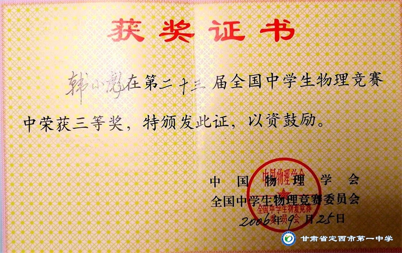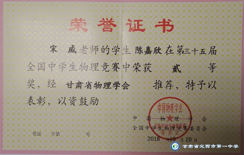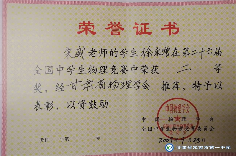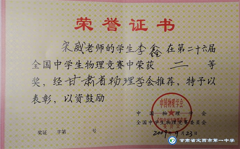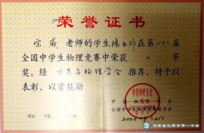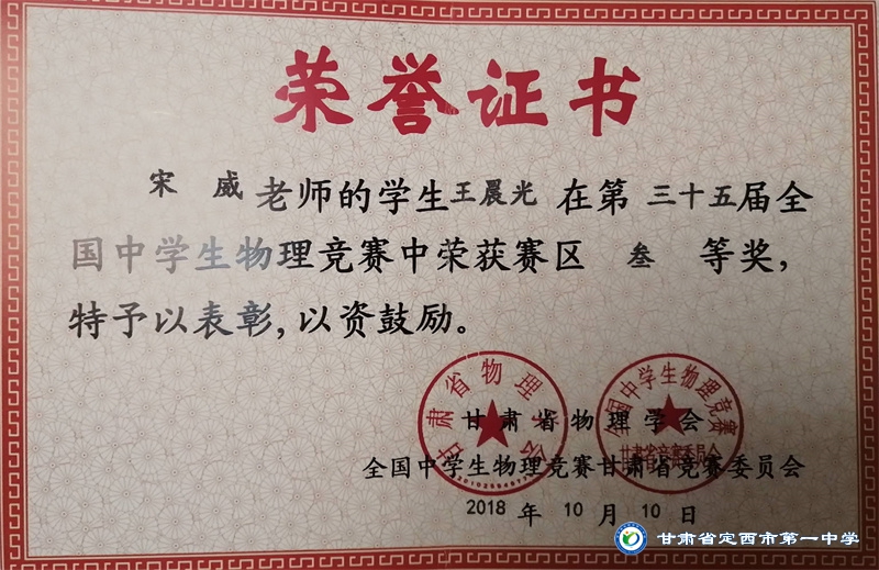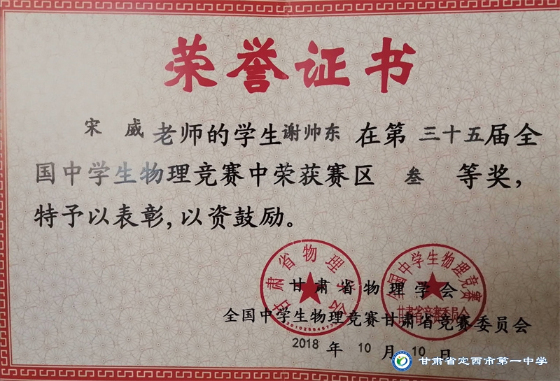 宋威老師在指導學生參加全國中學生物理競賽方面取得了良好成績。他所指導的學生中有二十多人次在全國中學生物理競賽中獲得國家級二、三等獎,其中有一人獲得省級一等獎。他本人也多次獲得“中國物理學會全國中學生物理競賽委員會”頒發的“全國中學生物理競賽優秀指導教師獎”。