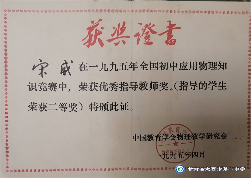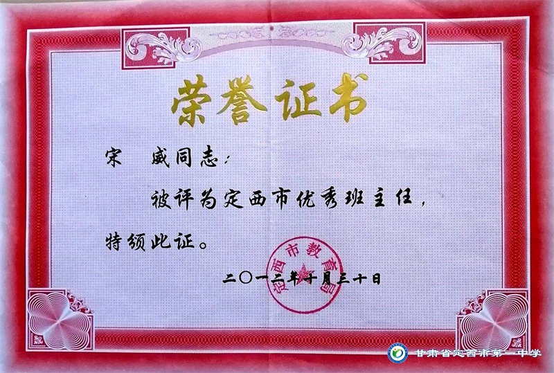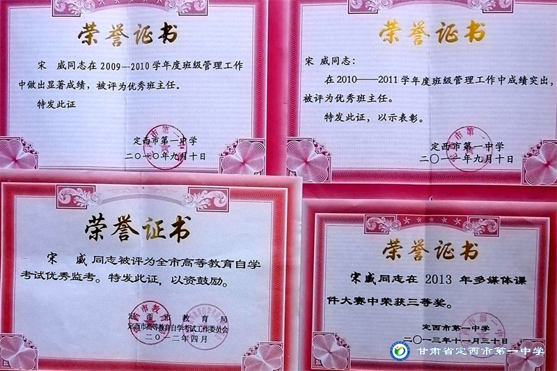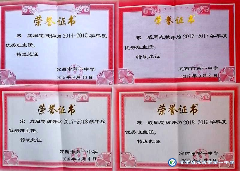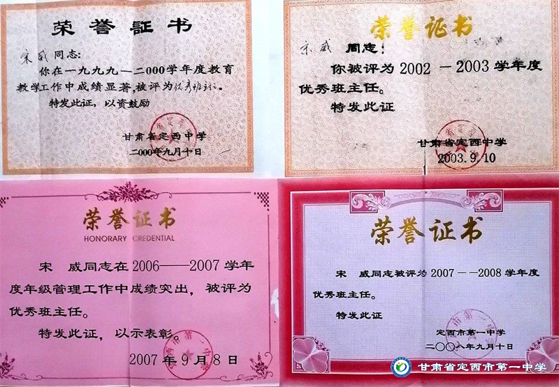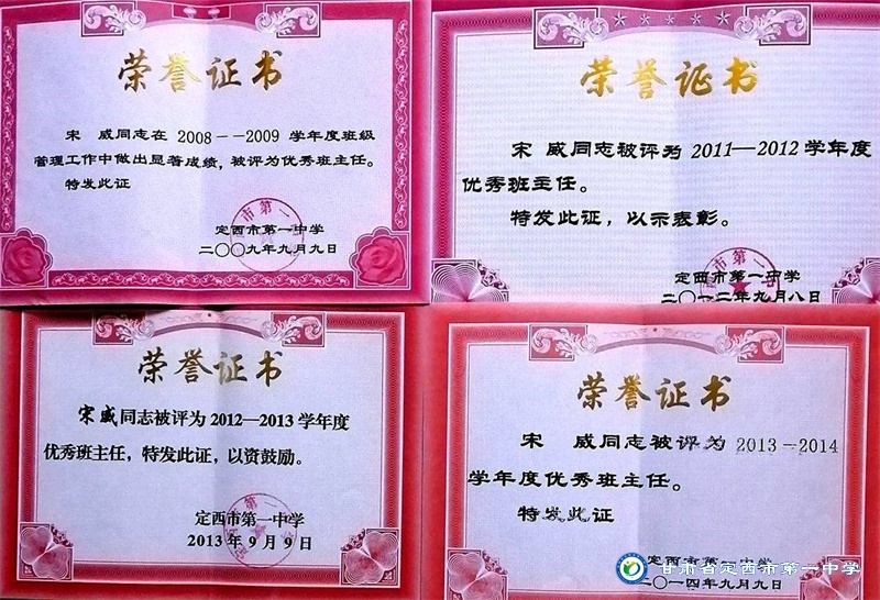 宋威老師自任職以來,任班主任二十多年。在班級管理中,他除了對學生能夠嚴格要求外,也非常關心學生的身體健康,心理健康。他非常重視學生的思想品德教育,注重把知識教育與思想教育融為一體,在班級管理中始終做到“勤”、“細”、“嚴”、“活”、“實”。日常工作從上早操到下晚自習,勤跟班,抓考勤,抓紀律,抓衛生,風雨無阻,無怨無悔,用自己的實際行動潛移默化地影響教育學生。他所帶班級,師生關系特別融洽,班級凝聚力強,同學們團結和睦,氣氛活躍,富有朝氣。他所帶班級多次獲得校級 “優秀班集體”稱號,而他本人在2000年,2003年,2005年,2007年,2008年,2009年,2010年,2011年,2012年,2013年,2014年,2015,2016年,2017年,2018年2019年共16次被學校評為優秀班主任。2012年10月被定西市教育局評為“定西市優秀班主任”。