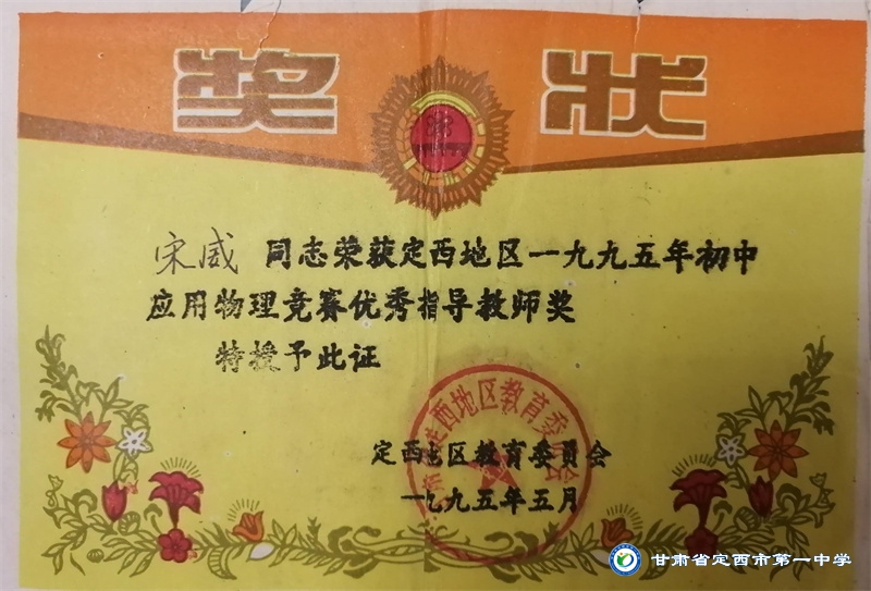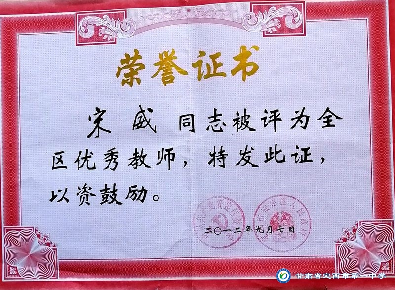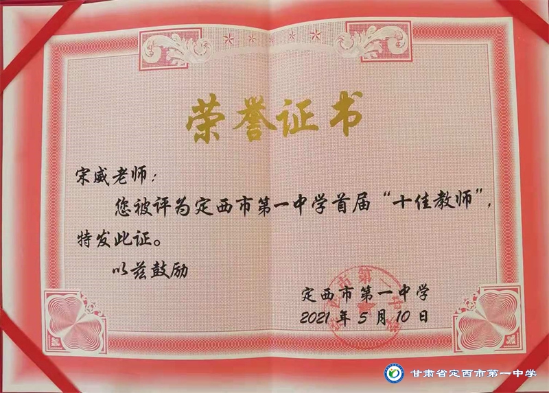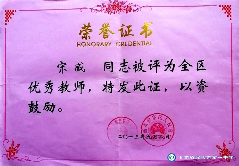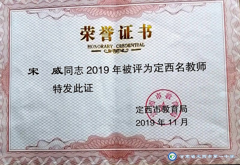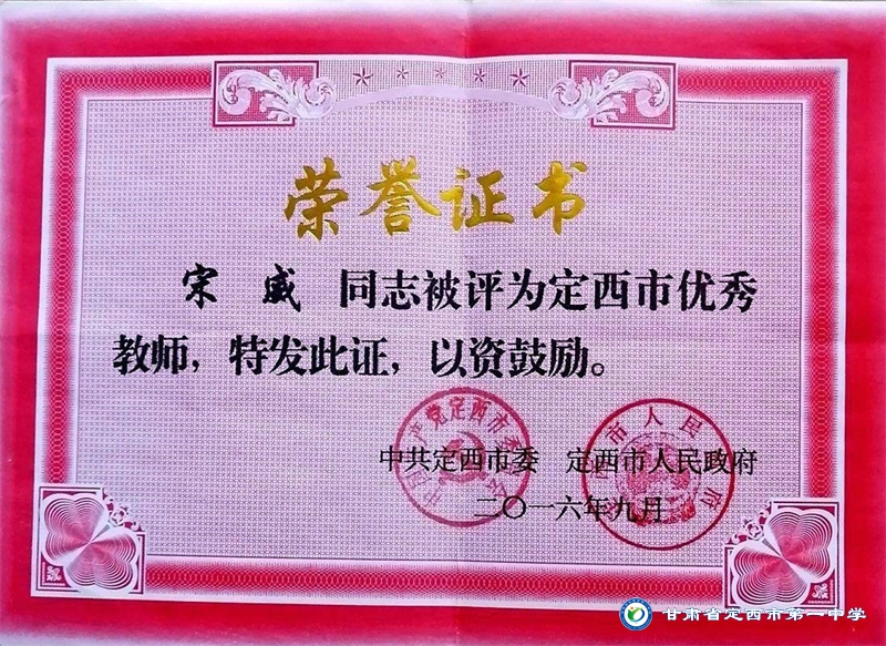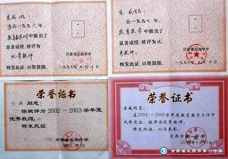 宋威老師一直工作于教學第一線,任務重,工作量大,任勞任怨。他在備課,講課,輔導,批改作業等教學環節上非常認真,教法靈活多樣,教學效果良好,深受學生歡迎,曾多次被定西市一中、中共安定區委、安定區人民政府,中共定西市委、定西市人民政府評為校級、縣級、市級優秀教師。在1996年,1997年,2003年分別被學校評為優秀教師,2004年被學校評為優秀教研組長,2013年在定西一中舉辦的多媒體課件大賽中獲得三等獎。2012年獲得由定西市教育局和定西市高等教育自學考試工作委員會頒發的“全市高等教育自學考試優秀監考”榮譽證書。2012年9月和2013年9月兩次被中共安定區區委、定西市安定區人民政府,評為全“全區優秀教師”, 2016年9月被中共定西市委、定西市人民政府評為“定西市優秀教師”。
