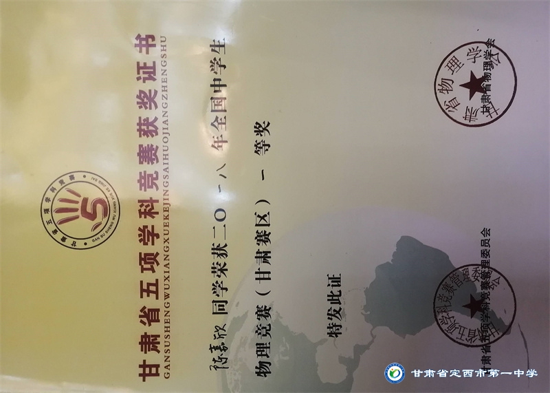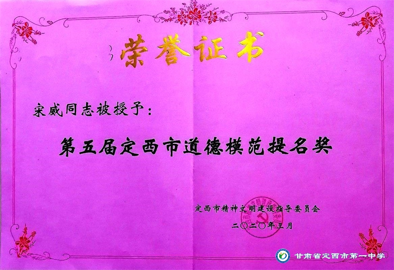 該同志于2019年10月獲得“定西市名教師”稱號,2020年3月年獲得第五屆定西市道德模范(敬業奉獻類)提名獎,2021年5月年被學校評為“定西市第一中學首屆十佳教師”。