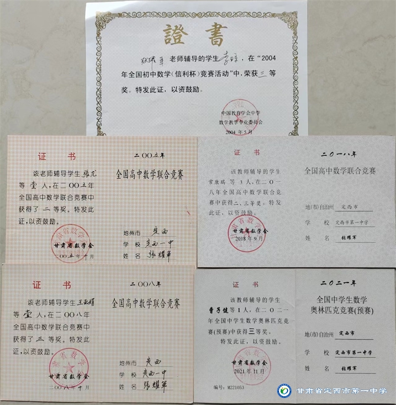 他所輔導的學生,有3人在全國初中數學競賽中分獲二、三等獎,有6人分獲全國高中數學聯賽甘肅賽區二、三等獎。他本人多次獲得全國初、高中數學聯合競賽優秀輔導教師獎。