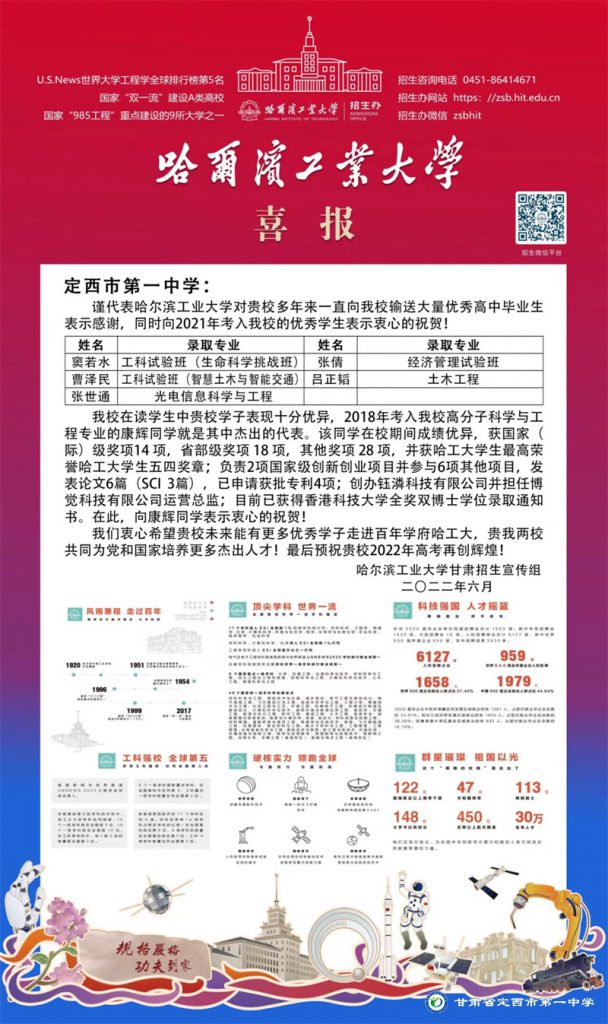 哈爾濱工業大學為我校發來喜報,對我校輸送的以康輝同學為代表的優秀學子給予了高度評價,同時衷心希望未來能有更多優秀學子走進百年學府哈工大。
