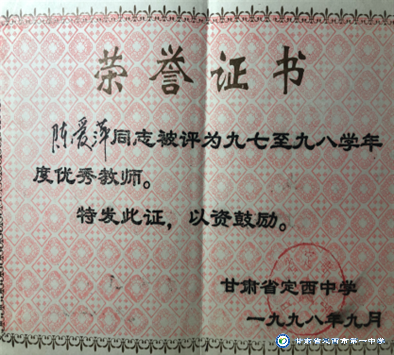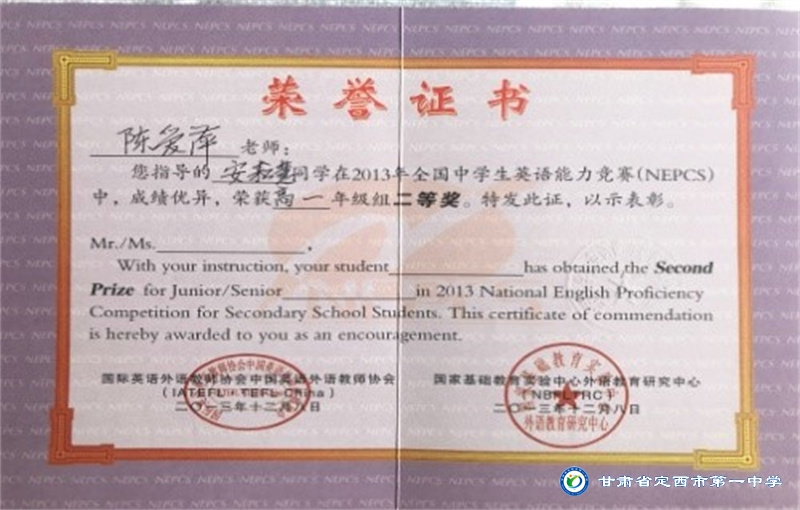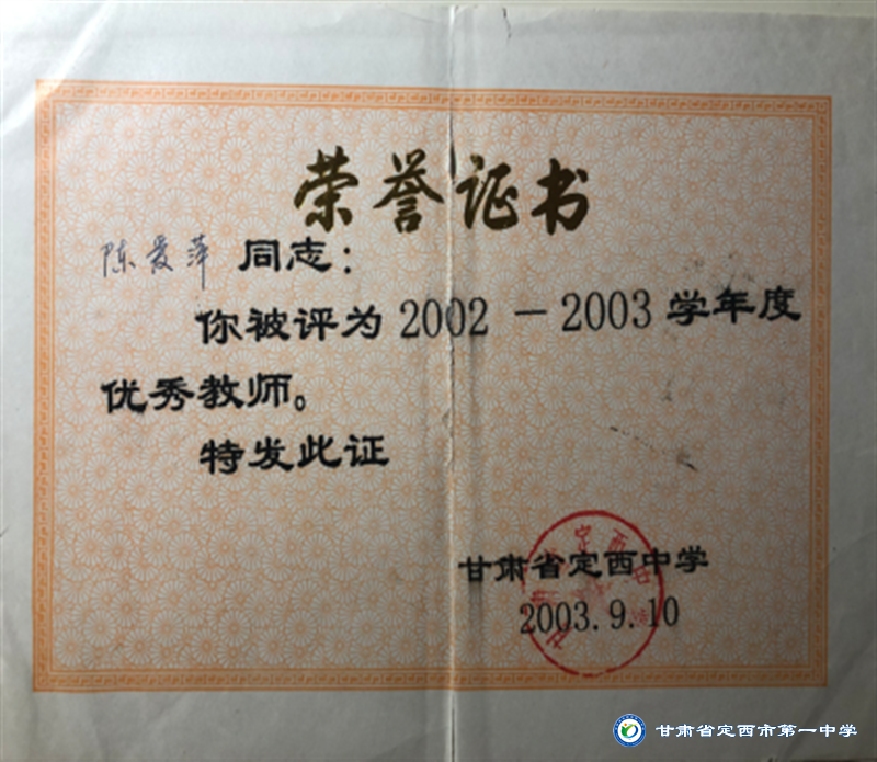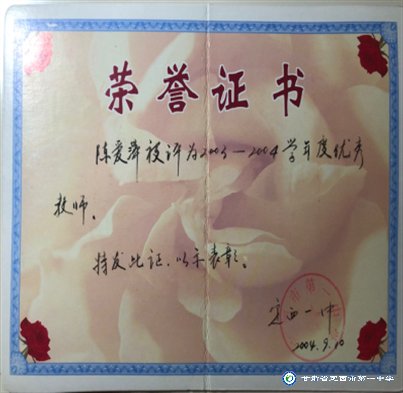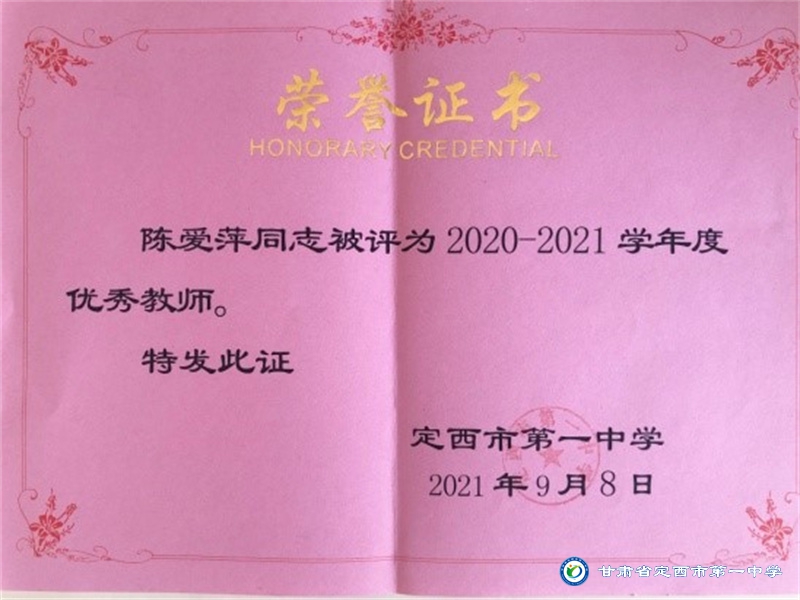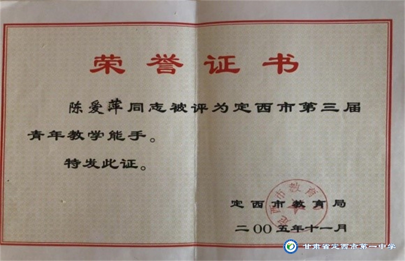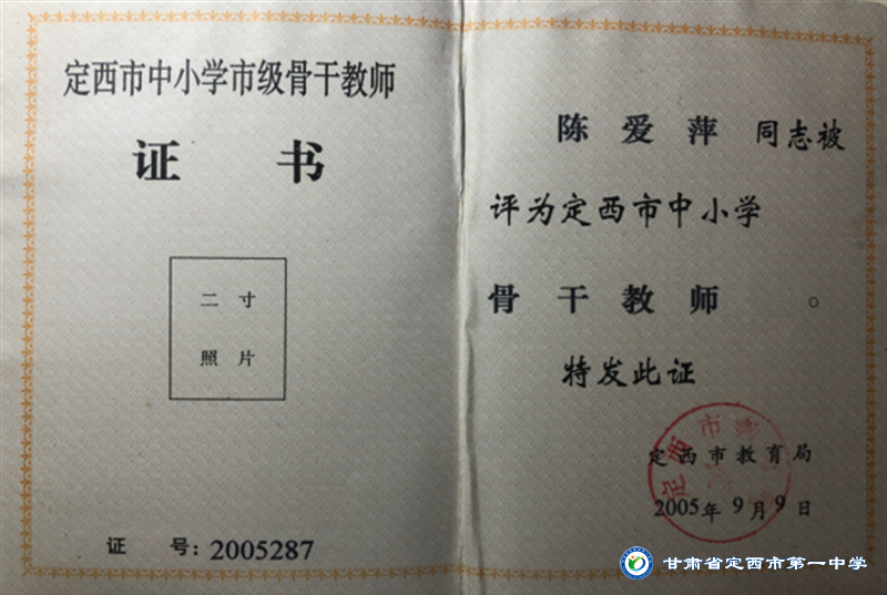 陳愛萍,定西市第一中學高級教師,英語教研組組長。1993年畢業(yè)于西北師大外語系,同年進入定西市第一中學工作。從教近30年,先后獲得“定西市骨干教師”、“定西市青年教學能手”、“全國中學生英語能力競賽優(yōu)秀輔導教師”等榮譽。