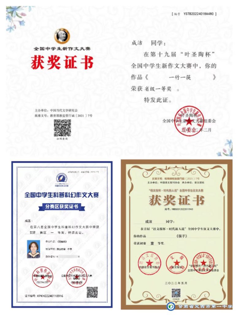 2022年2月,全國中學生科普科幻作文大賽甘肅賽區一等獎;