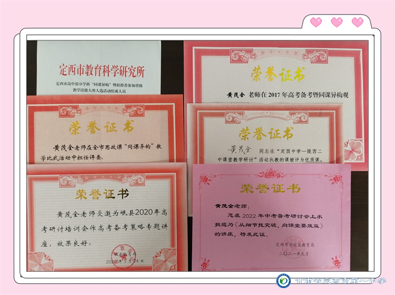 潛心研究教學,積極探索創新型課堂,是他鉆研新課程改革的基本理念。在教育教學中始終堅持立德樹人,注重提升學生的核心素養,不斷更新教學理念,形成了獨特的教學藝術風格,課堂氣氛活躍,深受學生喜愛。在優質課競賽中,獲甘肅省第三屆中小學教師教學技能大賽二等獎,定西市中學政治課堂教學競賽二等獎,定西市多媒體教學應用大賽活動中獲優質課三等獎。并且多次承擔培訓講座,在各類賽課中擔當評委獲得業內人士的一致好評。