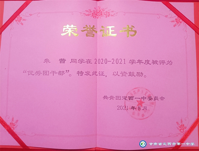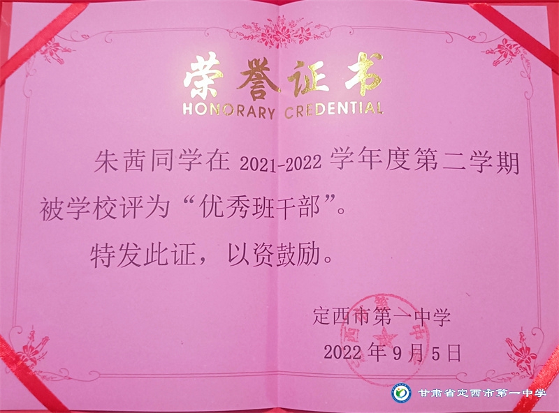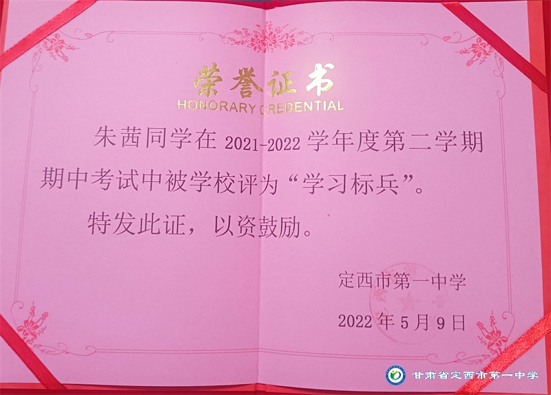 朱茜,女,2020級13班學生,共青團員,初中畢業于安定區中華路中學。她熱愛集體,積極上進。她學習刻苦,勤奮自律,曾多次獲得“學習標兵”、“優秀班干部”等榮譽。