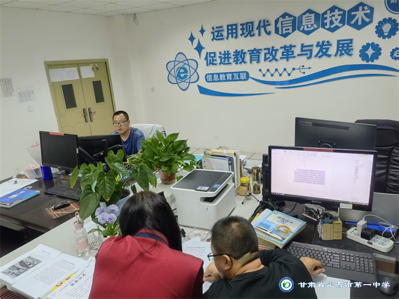 9月19日下午,定西市智慧教育評估小組一行對我校智慧教育標桿校創建工作進行指導驗收。驗收的時間不超過兩小時,然而背后的準備工作卻是漫長而艱難的。智慧教育評估資料需要學校教務處、教研處、保衛處等部門的積極配合,該項工作在上周信息中心就聯系了相關處室負責人,明確了各處室需要完成的內容,雖然抓手早,信息中心工作人員亦在周六周日加班加點準備相關材料,但是有些處室需要配合的資料遲遲不能到位,李曉剛老師在耐心等待無果后又一一打電話聯系,最終在9月18日晚間完成了相關資料的收集工作和檔案的整理工作。