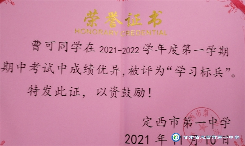 學習中的曹可不算最聰明的,但他卻是很努力的一個。他時刻以高標準要求自己。作為高中生他深深明白學習的重要性,從入學開始,他就樹立了明確的學習目標,一絲不茍的學習各門功課。他學習刻苦努力,虛心接受老師教導,不斷提高自己的學習成績,每個學期,他都能制定出各科的學習計劃,合理、周密地安排時間,課堂上,他能夠認真聽講、積極思考;課堂外,他還主動鉆研課堂上沒有學懂的內容。2021年11月被評為“學習標兵”。憑著一股不服輸的精神,他一步步前進,一點點進步,一天天成長。
