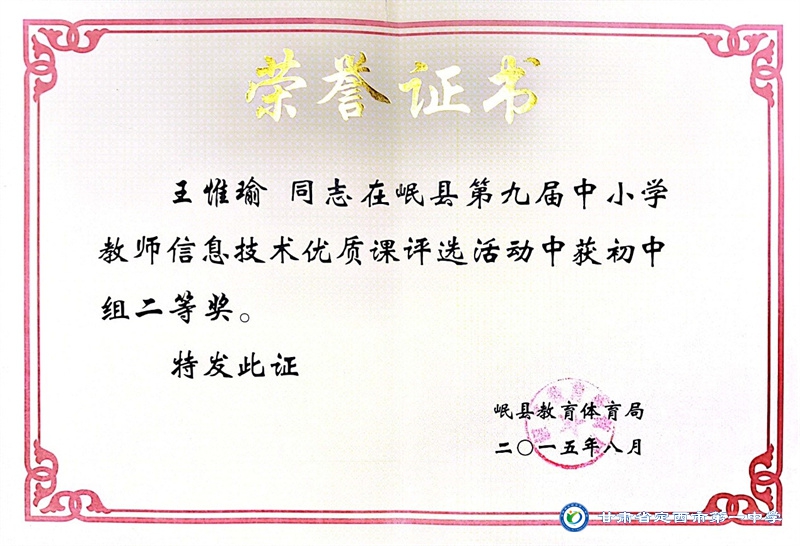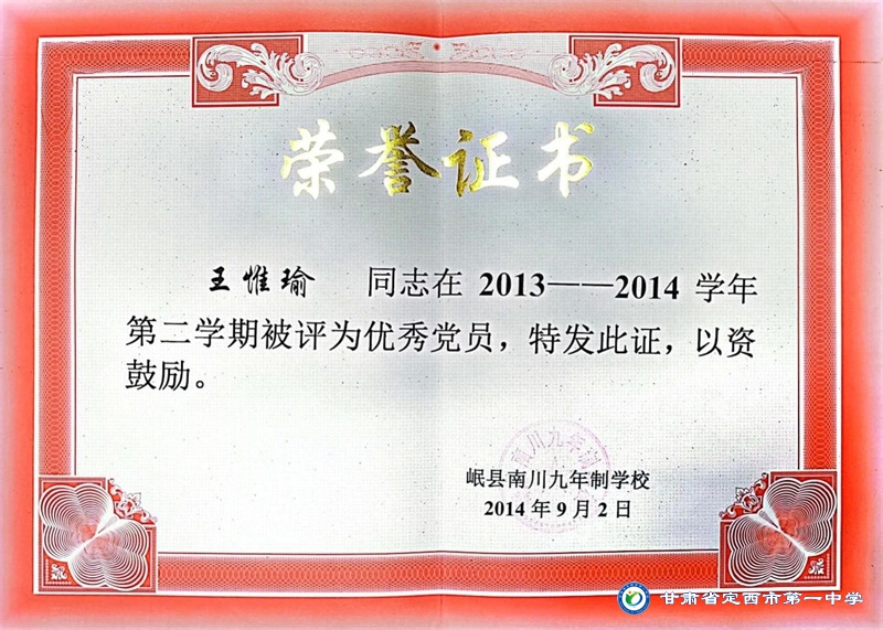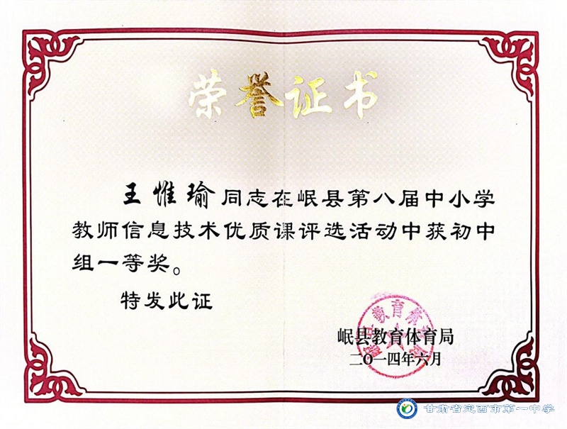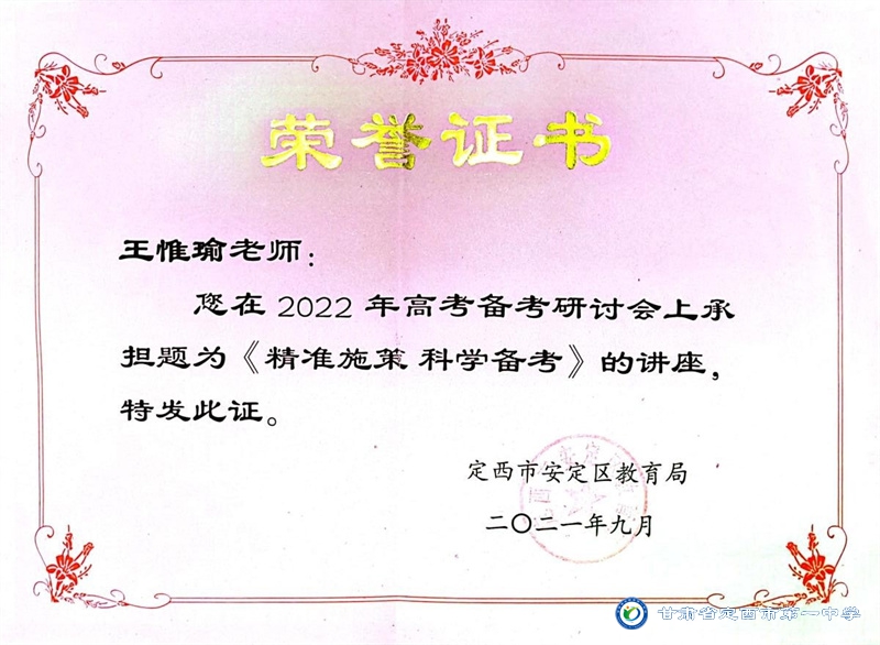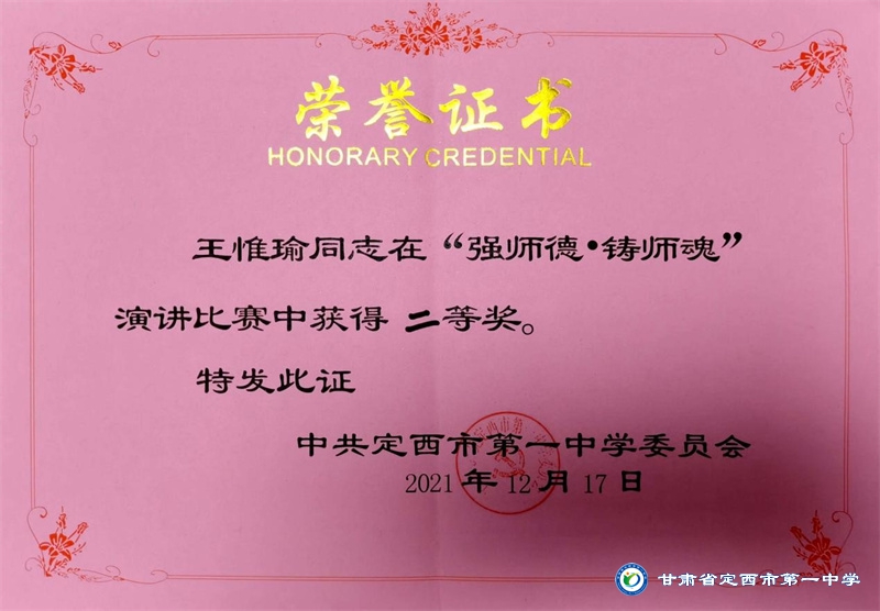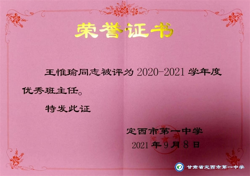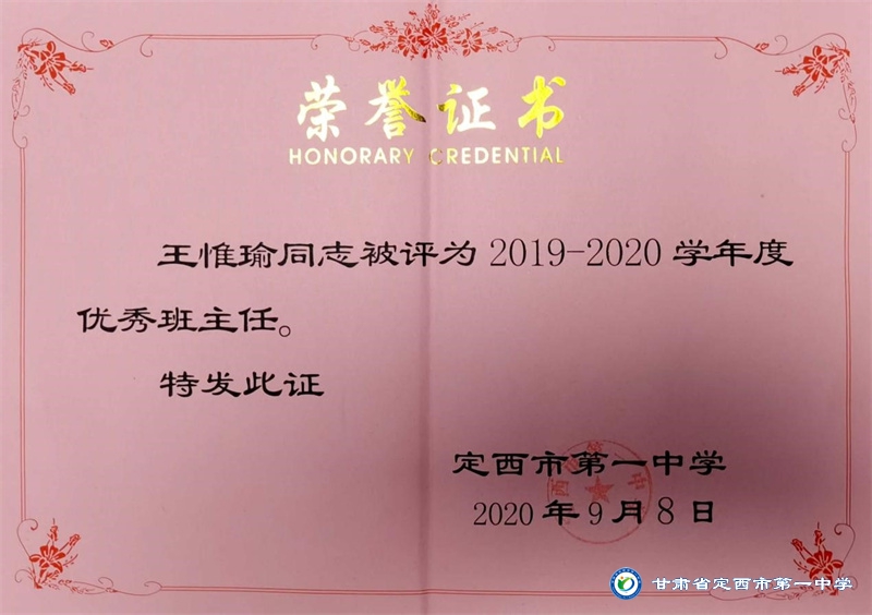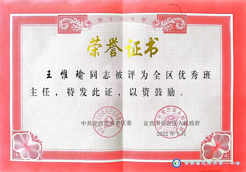 王惟瑜,男,漢族,中共黨員,定西市安定區人,畢業于西北師范大學,碩士研究生學歷。2013年10月參加工作,2017年9月到定西市第一中學工作至今。從教以來一直堅守在教育一線,多次獲得縣級信息技術優質課一、二等獎,校級優秀班主任、優秀教師、優秀共產黨員等榮譽稱號。2022年被定西市安定區人民政府評為優秀班主任。