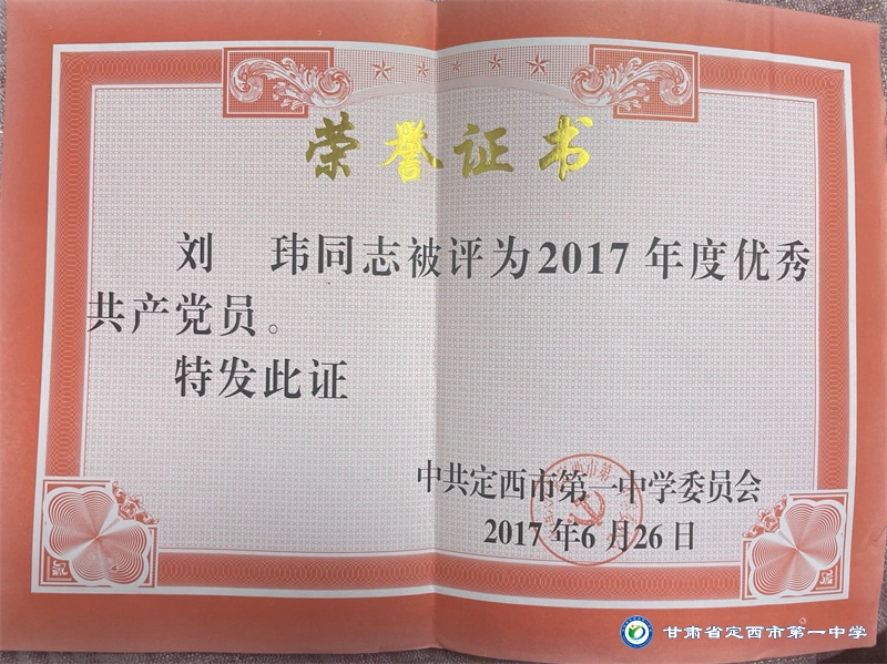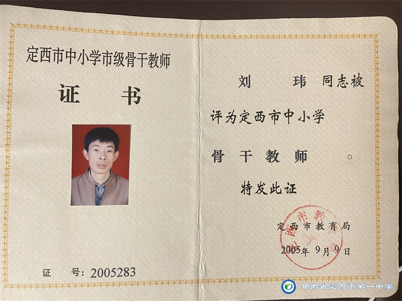 劉瑋,1975年生,甘肅省定西市岷縣人,中共黨員。1999年畢業于西北師范大學數學系,同年8月參加工作,任教于定西市第一中學,現為中小學高級教師。