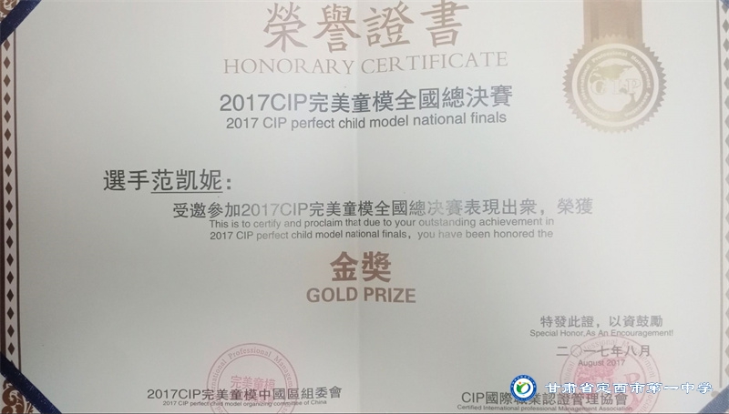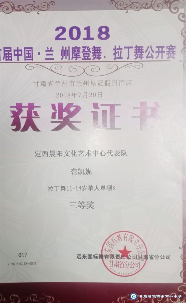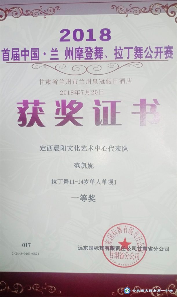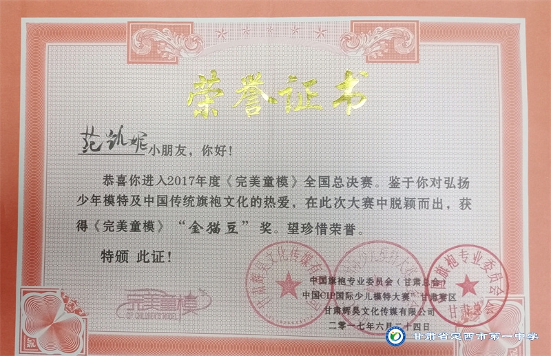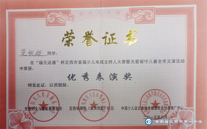 她志向遠大、興趣廣泛、多才多藝,擅長寫作、演講、舞蹈、鋼琴演奏等,能積極參與各項文藝活動并取得了喜人成績。2014年1月參與的節目在歡動甘肅2014校園春節聯歡晚會節目展評中榮獲金獎;2014年8月參加的舞蹈作品榮獲定西市舞蹈大賽兒童組三等獎;2015年8月在“福元運通”杯定西市首屆少兒主持人大賽中榮獲“優秀表演獎”;2017年6月進入《完美童模》全國總決賽并榮獲“金獎”;2017年10月獲中國CIP國際少兒模特大賽“金貓豆”獎;2018年7月在首屆中國.蘭州摩登舞.拉丁舞公開賽中獲得單人單項一等獎三枚,二等獎三枚;2018年7月在“書香延綿文脈 朗誦潤澤心靈”農商銀行杯2018定西市第一屆朗讀大賽中獲得三等獎; 2019年5月取得拉丁舞C級教師證;2021年1月通過鋼琴九級考試。