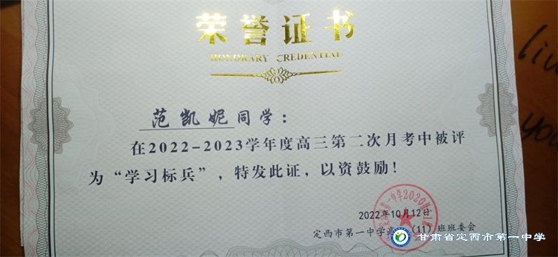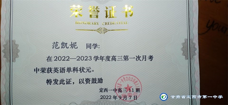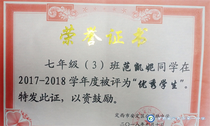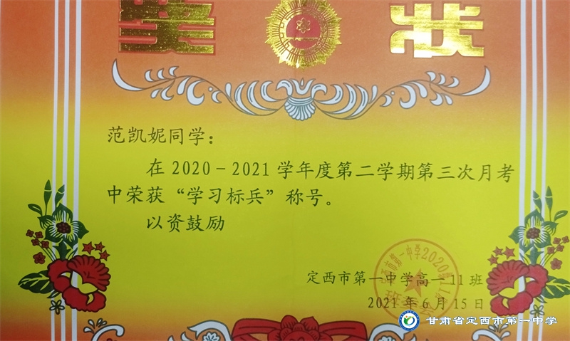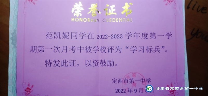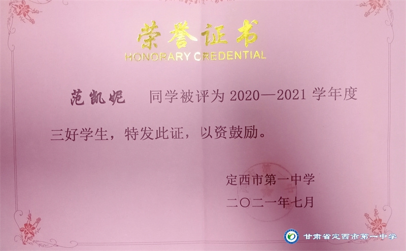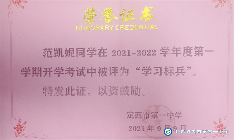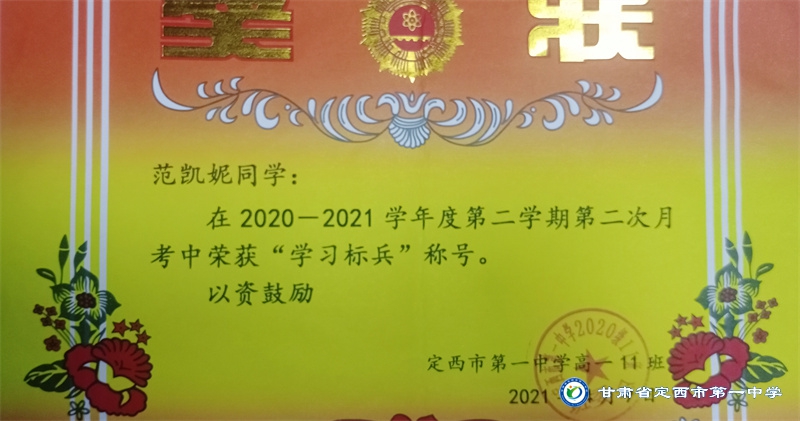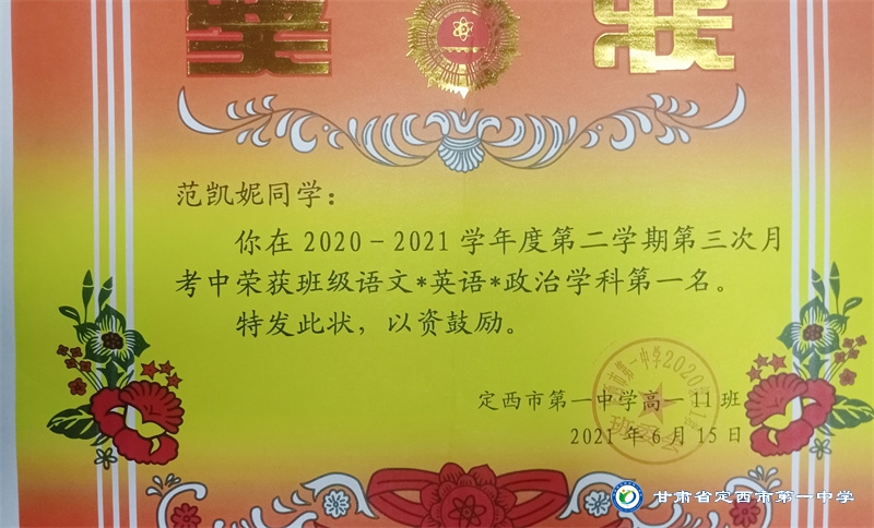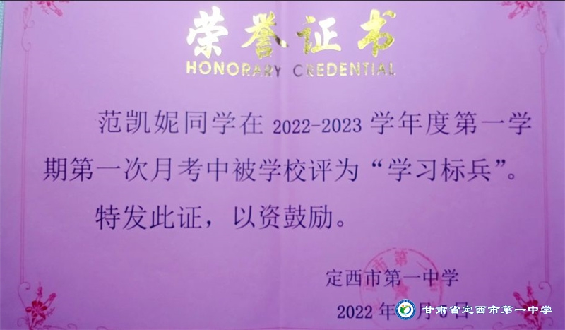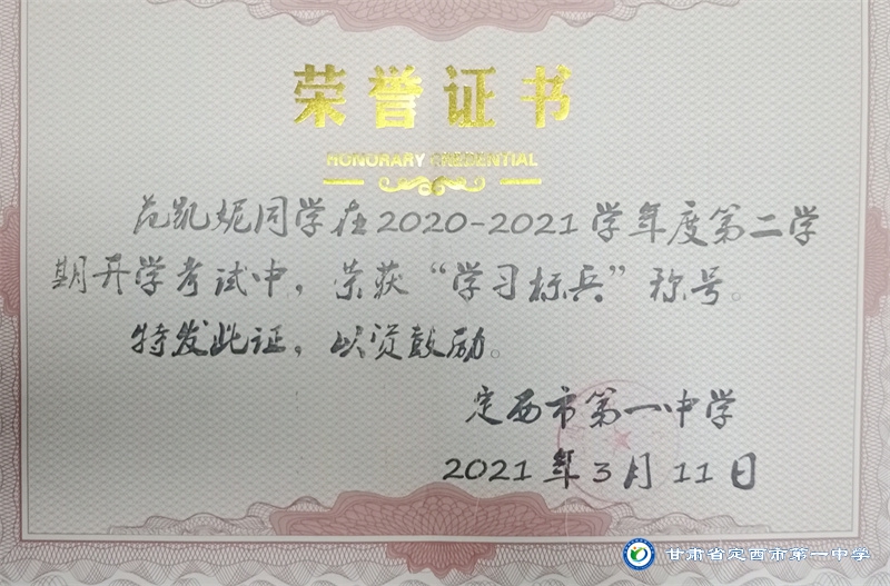 她是一個品學兼優的好學生,在校尊師守紀、 積極進取、學習刻苦、不驕不躁、關心集體、團結同學,既是同學的好榜樣,又是老師的好助手。小學階段,她多次被學校評為 “學習標兵”和“學科之星”。初中階段,她的校園生活更加充實,2018年3月被安定區公園路中學聘為“雨墨”文學社社長;2018年5月在安定區公園路中學第三屆校園讀書節征文活動中榮獲二等獎;2018年7月榮獲“譜寫改革頌 共筑中國夢”定西市詩文朗誦大賽二等獎; 2018年12月在安定區公園路中學舉辦的英語演講比賽中榮獲二等獎; 202年4月在定西市第一中學舉辦的“誦讀紅色經典 爭做時代新人”詩歌朗誦比賽中獲得二等獎;2018年9月、2019年9月分別被安定區公園路中學評為“優秀學生”; 2019年4月在學校舉辦的第四屆校園讀書節活動中榮獲“詩詞大會”亞軍,并獲得讀書筆記展評一等獎。高中階段的學習生活更具壓力,但她堅信只要付出就有收獲,總是能把繁重的學習變為自覺的行動。兩年半的高中學習,她從來沒有懈怠過,每次考試均以穩定的成績名列前茅。功夫不負有心人,2021年3月、4月、6月、9月、10月分別被定西市第一中學評為“學習標兵”,并在當年7月被學校評為 “三好學生”和“榮譽旗手”;在學校月考中,多次獲得年級第一名的好成績,英語科目出眾,多次被評為“英語單科狀元”。