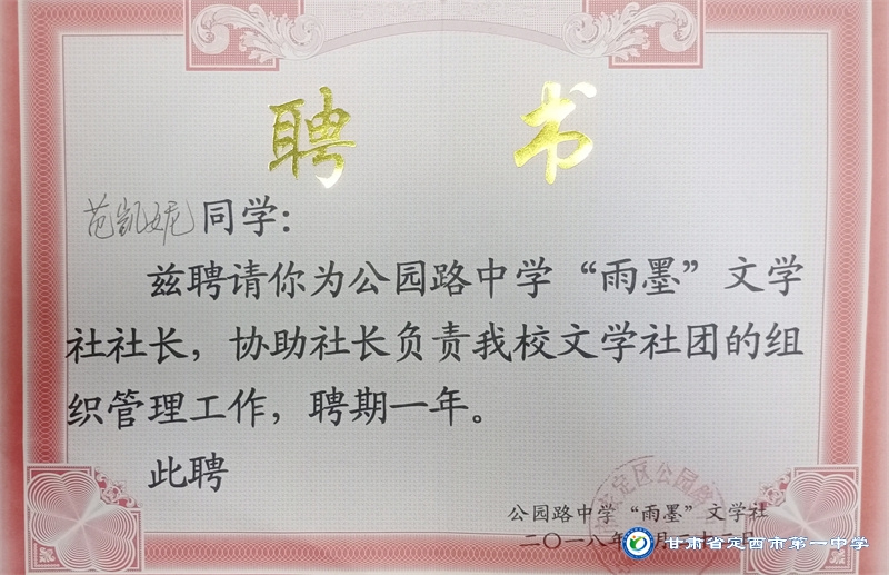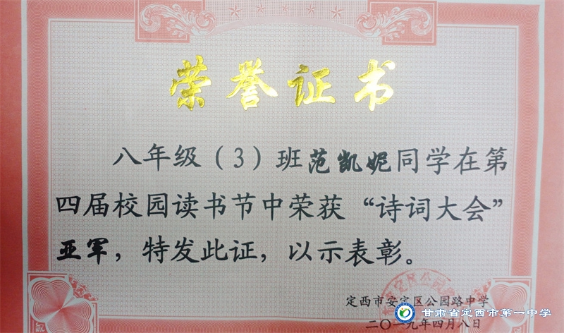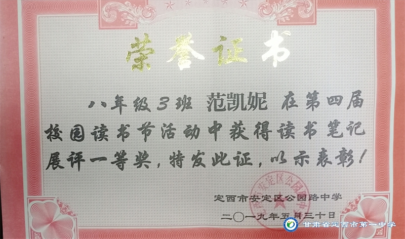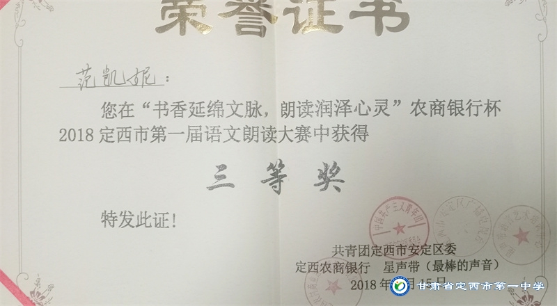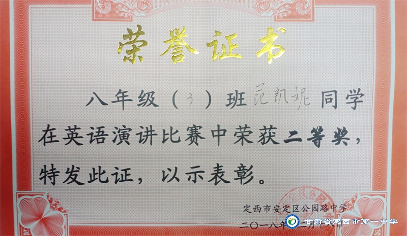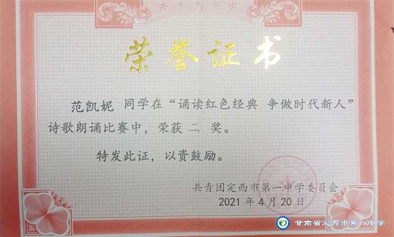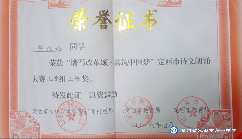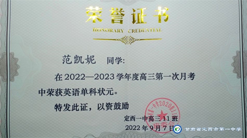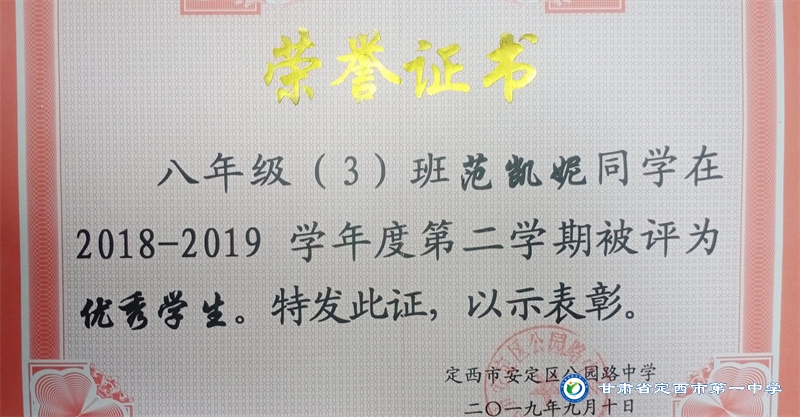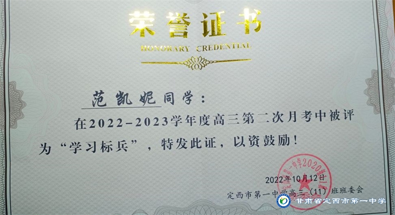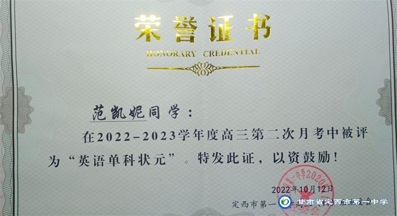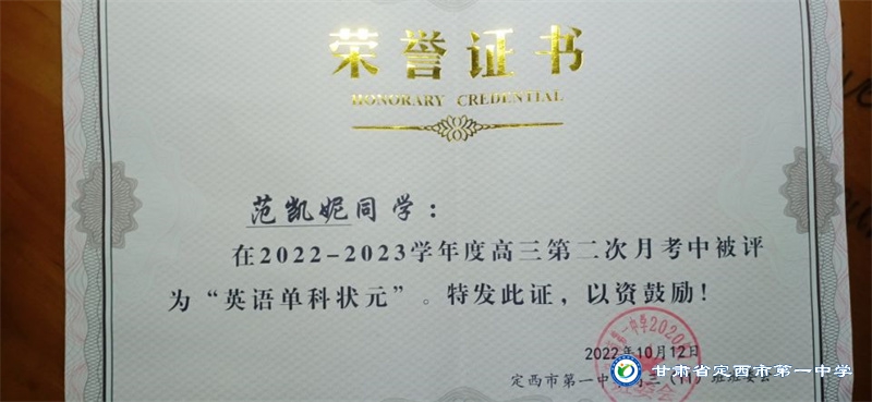 她是一個品學兼優的好學生,在校尊師守紀、 積極進取、學習刻苦、不驕不躁、關心集體、團結同學,既是同學的好榜樣,又是老師的好助手。小學階段,她多次被學校評為 “學習標兵”和“學科之星”。初中階段,她的校園生活更加充實,2018年3月被安定區公園路中學聘為“雨墨”文學社社長;2018年5月在安定區公園路中學第三屆校園讀書節征文活動中榮獲二等獎;2018年7月榮獲“譜寫改革頌 共筑中國夢”定西市詩文朗誦大賽二等獎; 2018年12月在安定區公園路中學舉辦的英語演講比賽中榮獲二等獎; 202年4月在定西市第一中學舉辦的“誦讀紅色經典 爭做時代新人”詩歌朗誦比賽中獲得二等獎;2018年9月、2019年9月分別被安定區公園路中學評為“優秀學生”; 2019年4月在學校舉辦的第四屆校園讀書節活動中榮獲“詩詞大會”亞軍,并獲得讀書筆記展評一等獎。高中階段的學習生活更具壓力,但她堅信只要付出就有收獲,總是能把繁重的學習變為自覺的行動。兩年半的高中學習,她從來沒有懈怠過,每次考試均以穩定的成績名列前茅。功夫不負有心人,2021年3月、4月、6月、9月、10月分別被定西市第一中學評為“學習標兵”,并在當年7月被學校評為 “三好學生”和“榮譽旗手”;在學校月考中,多次獲得年級第一名的好成績,英語科目出眾,多次被評為“英語單科狀元”。