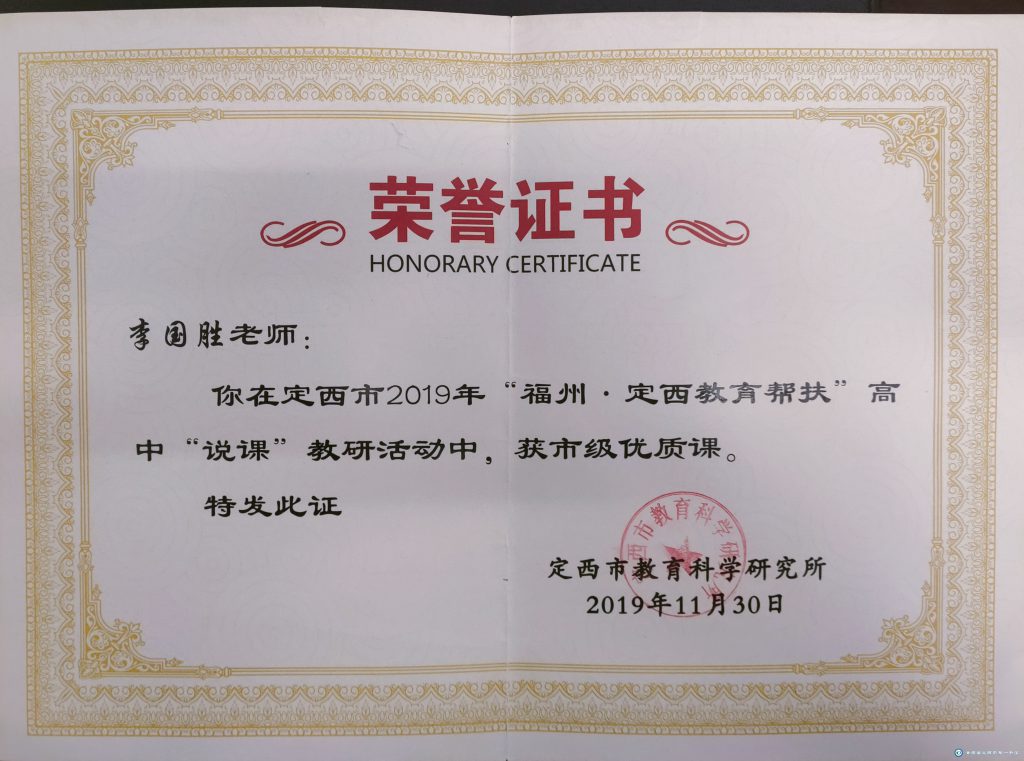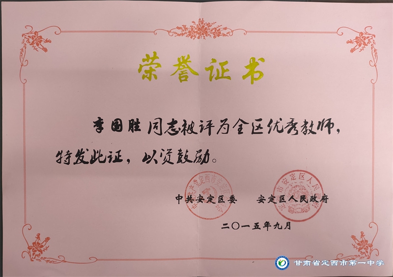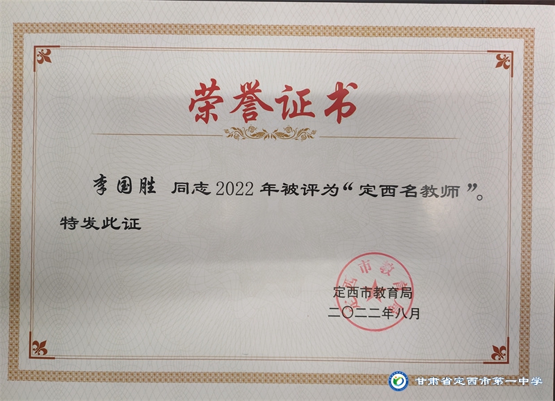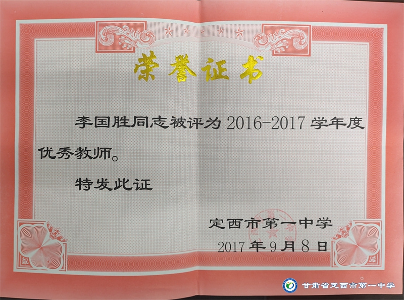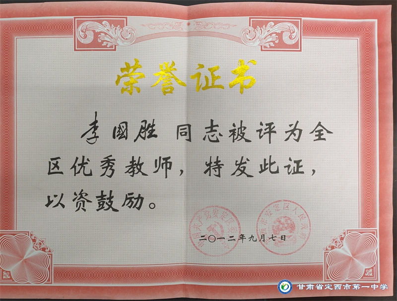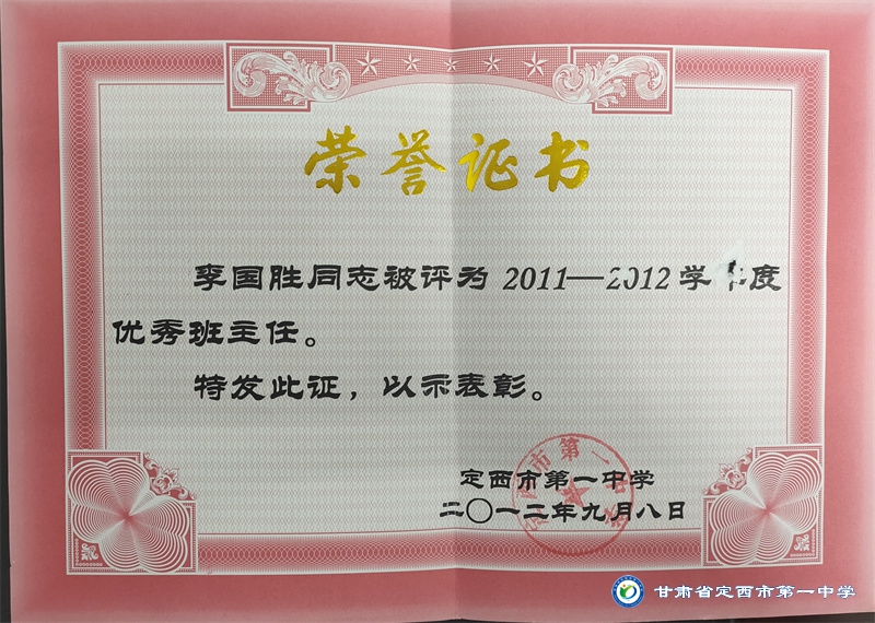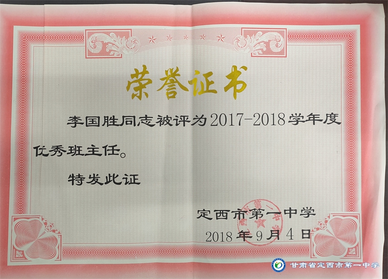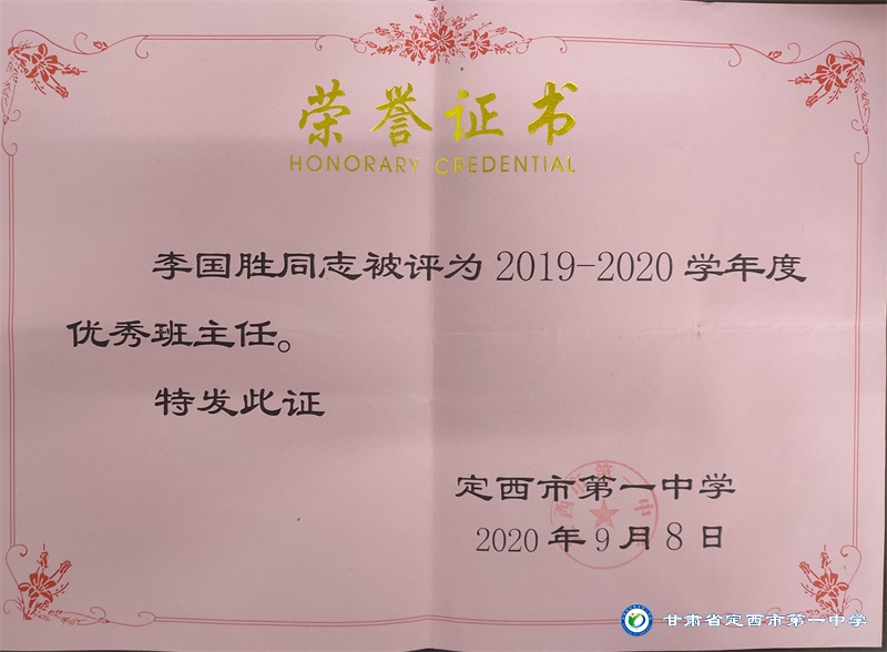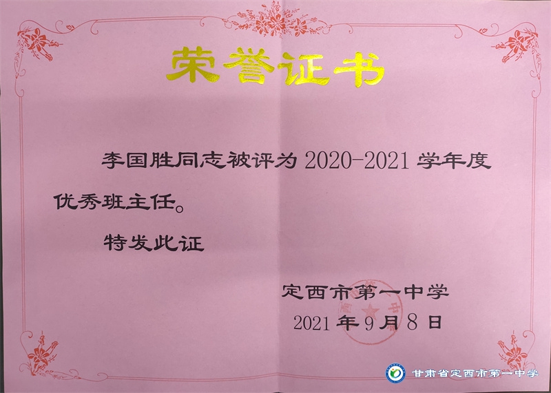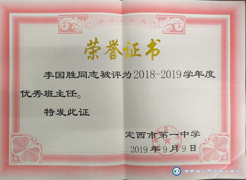 李國勝老師把教育當做事業,用心來做。他始終堅持“揚黃牛精神,做平凡工作”的作風。工作以來,擔任班主任工作多年,一直力求“身正為師,德高為范”,以嚴父的愛教育學生“千學萬學學做真人”,注重學生的品德培養,關注學生的全面發展。待業始終如一,待人真誠友善,多次受到政府和學校的表彰。2012年、2015年先后被評為“安定區優秀教師,2012年、2016年、2017年、2018年、 2019 年、2020年、2021年被多次評為校級優秀班主任。
