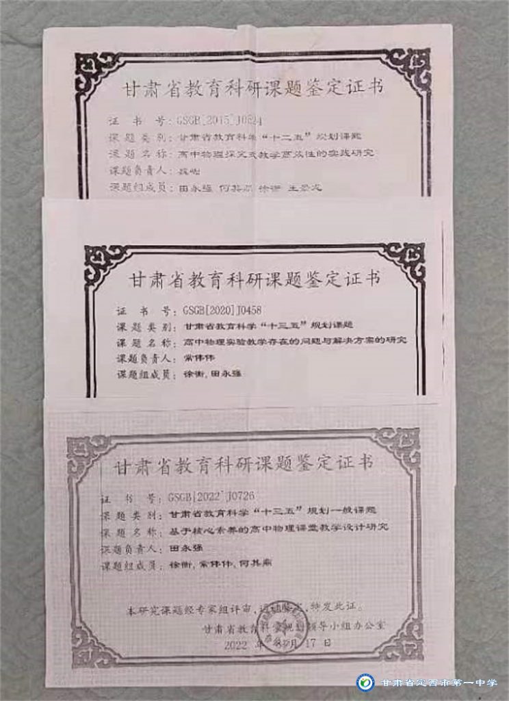 2022年8月17參與田永強校長主持的省級課題并獲得鑒定通過。本人為第二作者,甘肅省教育科學“十三五”規劃一般課題《基于核心素養的高中物理課堂教學設計研究》。