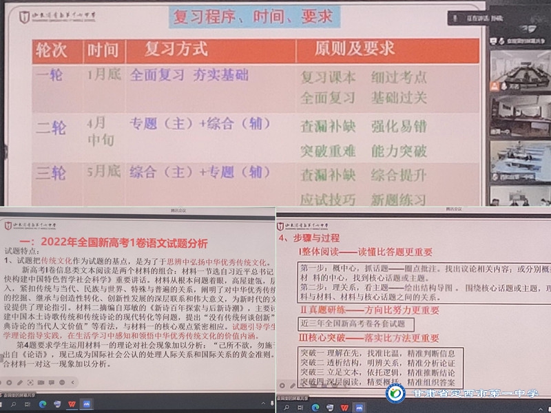 教研,不止于理論;成長,立足于思考;發展,貴在于交流。為全面推進“三抓三促”行動,汲取先進教研理念,提升教師基本素養,推進我校集體備課工作的全面落實,為新高考助力,5月23日上午,我校組織并邀請青島十七中、西和縣第一中學、甘肅省通渭縣第一中學的高二語文備課組教師團隊共同進行了以“凝聚智慧,交流發展”為主題的高二年級語文學科線上集備暨高考備考校際交流活動,甘肅省臨夏州積石山縣積石中學校長董洪海一行團隊參與了現場觀摩及指導。本次活動由我校副校長田永強主持。