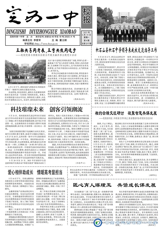 定西一中校報2023年第四期 時間:2023-06-26 分類:校報校刊 (撰稿:董立順 審核:董立順 田永強 監審:肖進雄) 定西一中校報2023年第四期下載 分享: 上一個: 定西一中校報2023年第三期 下一個: 定西一中校報2023年第五期 相關文章 【“三抓三促”行動進行時】定西一中校報2025年第八期 【“三抓三促”行動進行時】定西一中校報2025年第七期 【“三抓三促”行動進行時】定西一中校報2025年第六期 【“三抓三促”行動進行時】定西一中校報2025年第五期 【“三抓三促”行動進行時】定西一中校報2025年第四期 【“三抓三促”行動進行時】定西一中校報2025年第三期 【“三抓三促”行動進行時】定西一中校報2025年第二期 【“三抓三促”行動進行時】定西一中校報2025年第一期