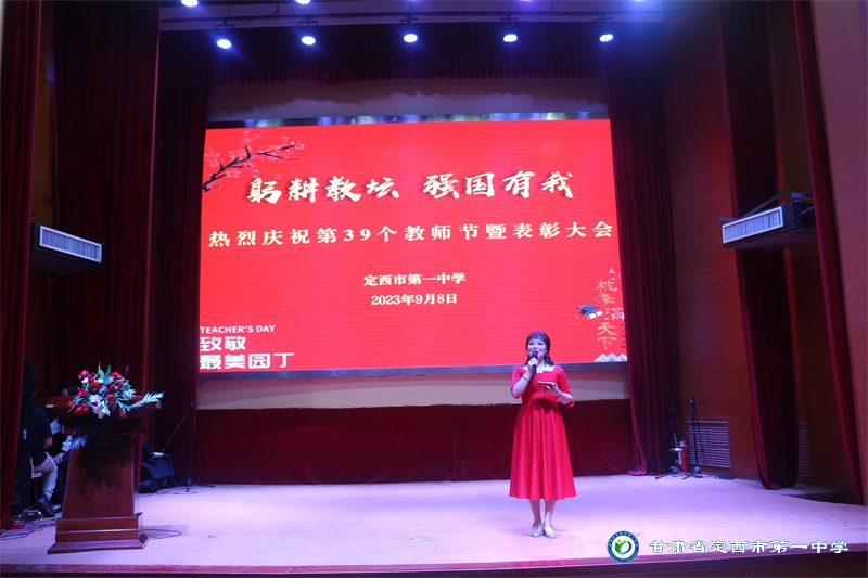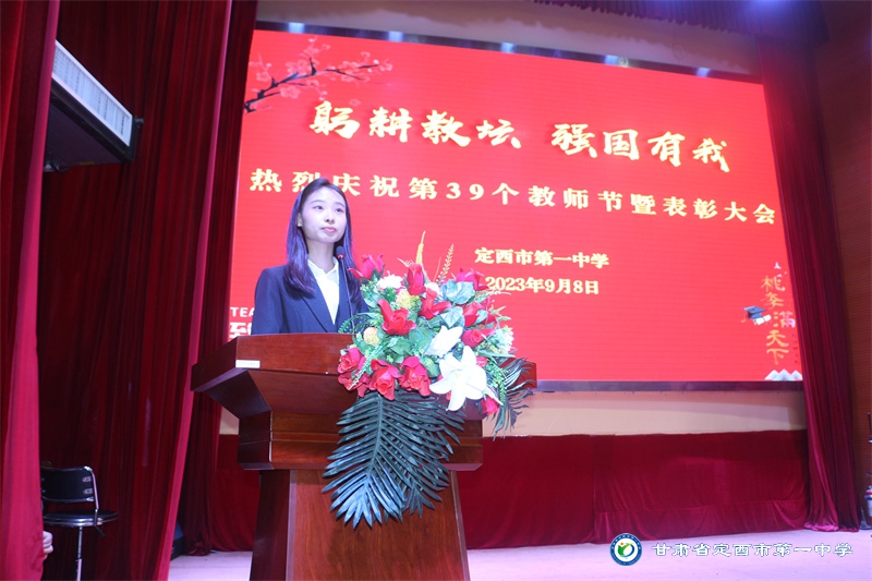 張穎代表新教師發言,作為一名從定西一中畢業又重返母校的學子,她深切懷念在母校的點點滴滴;作為一名剛剛走上講臺的青年教師,她牢記學校領導和諸位前輩的教導,立志扎實學識,努力站穩講臺,將不斷用功、用心、用情,努力成為一名“四有”好老師。