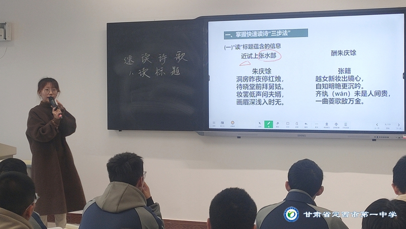 語文老師趙健卓以《古代詩歌鑒賞》為主題,“速讀詩歌”為主線,高考真題為抓手,讀標題、讀注釋、找關鍵為步驟,巧妙的分析、講解了高考題中對詩歌鑒賞的考查應用。方向把握準確,備考指導性強。