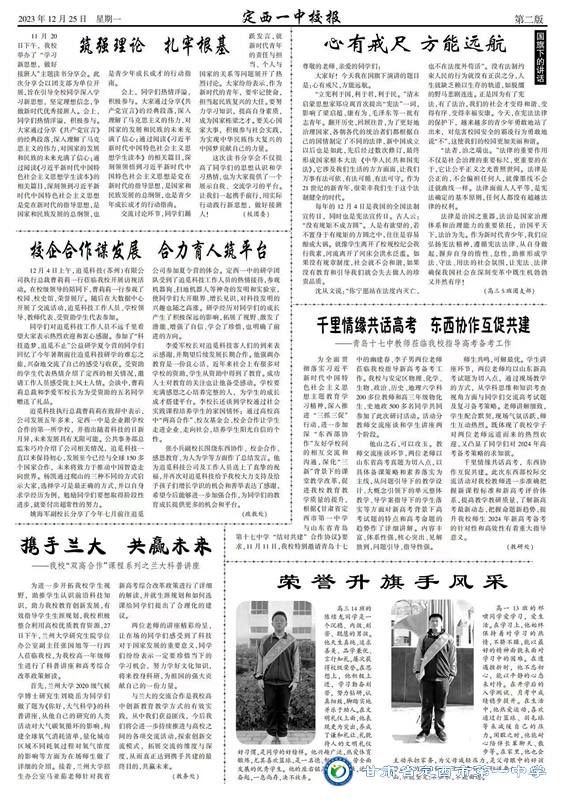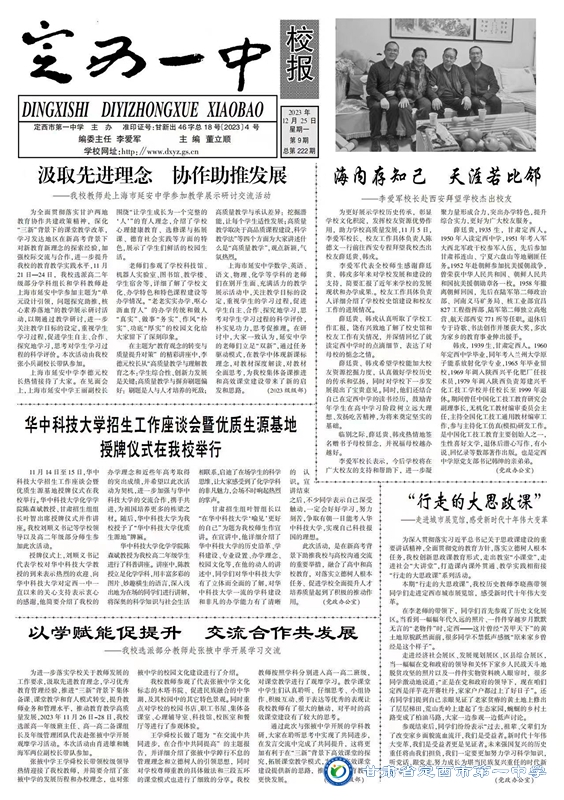 【“三抓三促”行動進行時】定西一中校報2023年第九期 時間:2023-12-27 分類:三抓三促/ 校報校刊 (撰稿:董立順 審核:陳玉琴 田永強 監審:肖進雄) 定西一中校報2023年第九期下載 分享: 上一個: 【“三抓三促”行動進行時】研學實踐促成長 最美課堂在路上——我校部分師生赴蘭州參加研學實踐活動 下一個: 【“三抓三促”行動進行時】定西一中校報2023年第十期 相關文章 喜報——我校學子在2025年第42屆全國中學生物理競賽甘肅聯賽中榮獲佳績 定西一中“對話名校 筑夢未來”系列活動|哈爾濱工業大學專場 【區域聯動 眾行致遠】智慧共享 ?智研共贏 【研經悟理 授業傳道】廣學集智逐光行,求變則通耘夢田 【“三抓三促”行動進行時】定西一中校報2025年第八期 【“三抓三促”行動進行時】師徒同心展匠心 青藍攜手綻芳華 【“三抓三促”行動進行時】幫扶搭臺連校際 互鑒同行共育人 【“三抓三促”行動進行時】區域聯動促深度交流?攜手并進謀共同發展