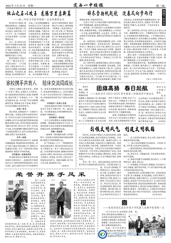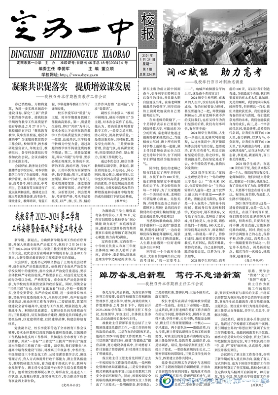 【“三抓三促”行動進行時】定西一中校報2024年第一期 時間:2024-03-25 分類:三抓三促/ 校報校刊 (撰稿:董立順 審核:陳玉琴 田永強 監審:肖進雄) 定西一中校報2024年第一期下載 分享: 上一個: 【“三抓三促”行動進行時】聚焦學科競賽 ?助力選優培優 下一個: 【“三抓三促”行動進行時】喜報—我校學子在第20屆“外研社杯”全國中學生外語素養大賽中榮獲佳績 相關文章 喜報——我校學子在2025年第42屆全國中學生物理競賽甘肅聯賽中榮獲佳績 定西一中“對話名校 筑夢未來”系列活動|哈爾濱工業大學專場 【區域聯動 眾行致遠】智慧共享 ?智研共贏 【研經悟理 授業傳道】廣學集智逐光行,求變則通耘夢田 【“三抓三促”行動進行時】定西一中校報2025年第八期 【“三抓三促”行動進行時】師徒同心展匠心 青藍攜手綻芳華 【“三抓三促”行動進行時】幫扶搭臺連校際 互鑒同行共育人 【“三抓三促”行動進行時】區域聯動促深度交流?攜手并進謀共同發展