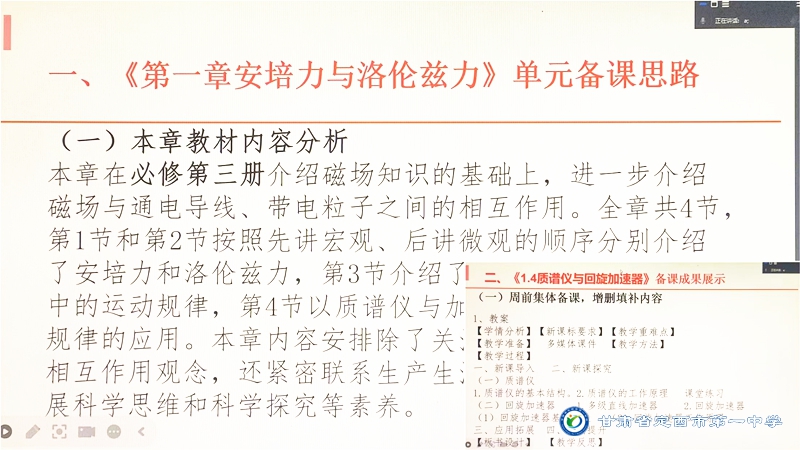 為全面貫徹習(xí)近平新時代中國特色社會主義思想,深入研究普通高中新課程標(biāo)準(zhǔn),將新理念、新方法、新要求融入教學(xué)實(shí)踐,轉(zhuǎn)變育人方式,提升教學(xué)效果,加強(qiáng)校際間教研交流,充分發(fā)揮集體智慧,推進(jìn)集體備課工作的全面落實(shí),3月29日下午,我校本著“共同交流研討、共同進(jìn)步提高”的原則,組織并邀請平?jīng)鲆恢?、通渭一中、漳縣一中、東方紅中學(xué)、福臺中學(xué)教師開展了以“凝聚智慧,交流發(fā)展”為主題,以高中物理人教版選擇性必修第二冊第一章第四節(jié)“質(zhì)譜儀與回旋加速器”為內(nèi)容的線上集體備課校際交流活動。