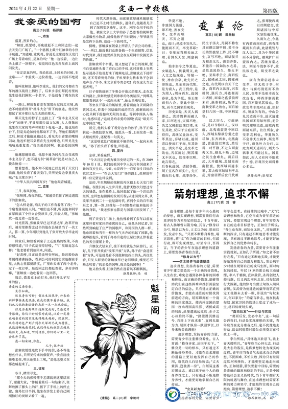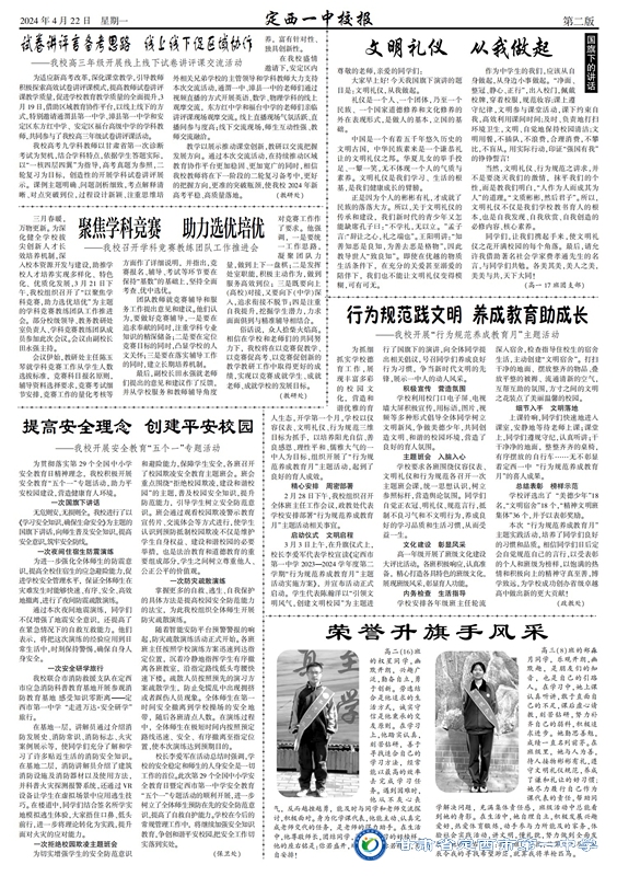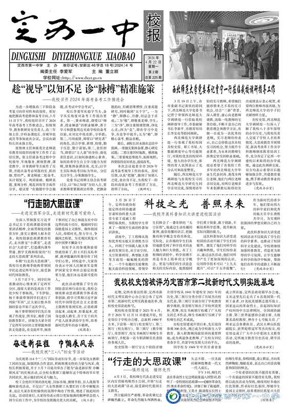 【“三抓三促”行動(dòng)進(jìn)行時(shí)】定西一中校報(bào)2024年第二期 時(shí)間:2024-04-24 分類:三抓三促/ 校報(bào)校刊 (撰稿:董立順 審核:陳玉琴 田永強(qiáng) 監(jiān)審:肖進(jìn)雄). 定西一中校報(bào)2024年第二期下載 分享: 上一個(gè): 【“三抓三促”行動(dòng)進(jìn)行時(shí)】“典耀中華 書香校園”系列活動(dòng)優(yōu)秀作品展播 下一個(gè): 【“三抓三促”行動(dòng)進(jìn)行時(shí)】青春心向黨,挺膺有擔(dān)當(dāng)——我校舉行紀(jì)念五四運(yùn)動(dòng)105周年特別主題團(tuán)日暨集中入團(tuán)活動(dòng) 相關(guān)文章 喜報(bào)——我校學(xué)子在2025年第42屆全國中學(xué)生物理競賽甘肅聯(lián)賽中榮獲佳績 定西一中“對話名校 筑夢未來”系列活動(dòng)|哈爾濱工業(yè)大學(xué)專場 【區(qū)域聯(lián)動(dòng) 眾行致遠(yuǎn)】智慧共享 ?智研共贏 【研經(jīng)悟理 授業(yè)傳道】廣學(xué)集智逐光行,求變則通耘夢田 【“三抓三促”行動(dòng)進(jìn)行時(shí)】定西一中校報(bào)2025年第八期 【“三抓三促”行動(dòng)進(jìn)行時(shí)】師徒同心展匠心 青藍(lán)攜手綻芳華 【“三抓三促”行動(dòng)進(jìn)行時(shí)】幫扶搭臺連校際 互鑒同行共育人 【“三抓三促”行動(dòng)進(jìn)行時(shí)】區(qū)域聯(lián)動(dòng)促深度交流?攜手并進(jìn)謀共同發(fā)展