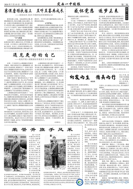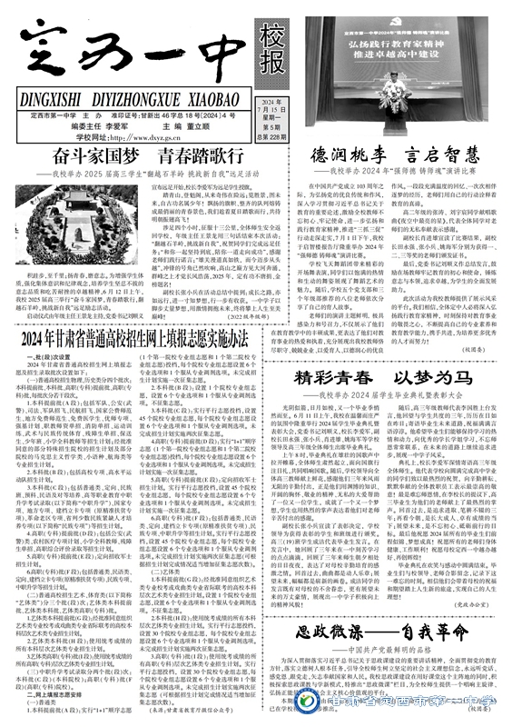 【“三抓三促”行動進行時】定西一中校報2024年第五期 時間:2024-07-15 分類:三抓三促/ 校報校刊 (撰稿:董立順 審核:陳玉琴 田永強 監審:肖進雄) 定西一中校報2024年第五期下載 分享: 上一個: 【“三抓三促”行動進行時】三校聯合共建青藍平臺 區域協作攜手基業長青 下一個: “弘揚踐行教育家精神”系列微黨課 相關文章 喜報——我校學子在2025年第42屆全國中學生物理競賽甘肅聯賽中榮獲佳績 定西一中“對話名校 筑夢未來”系列活動|哈爾濱工業大學專場 【區域聯動 眾行致遠】智慧共享 ?智研共贏 【研經悟理 授業傳道】廣學集智逐光行,求變則通耘夢田 【“三抓三促”行動進行時】定西一中校報2025年第八期 【“三抓三促”行動進行時】師徒同心展匠心 青藍攜手綻芳華 【“三抓三促”行動進行時】幫扶搭臺連校際 互鑒同行共育人 【“三抓三促”行動進行時】區域聯動促深度交流?攜手并進謀共同發展