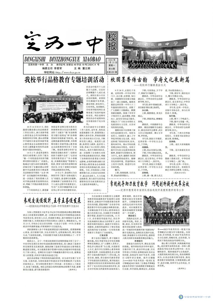 【“三抓三促”行動進行時】定西一中校報2024年第八期 時間:2024-11-27 分類:三抓三促/ 校報校刊 (撰稿:董立順 審核:王景龍 田永強 監審:肖進雄) 定西一中校報2024年第八期下載 分享: 上一個: 【“三抓三促”行動進行時】高考備考助力基地建設 ?區域聯動共謀教育發展 下一個: 【“三抓三促”行動進行時】精準導航·決勝未來 相關文章 喜報——我校學子在2025年第42屆全國中學生物理競賽甘肅聯賽中榮獲佳績 定西一中“對話名校 筑夢未來”系列活動|哈爾濱工業大學專場 【區域聯動 眾行致遠】智慧共享 ?智研共贏 【研經悟理 授業傳道】廣學集智逐光行,求變則通耘夢田 【“三抓三促”行動進行時】定西一中校報2025年第八期 【“三抓三促”行動進行時】師徒同心展匠心 青藍攜手綻芳華 【“三抓三促”行動進行時】幫扶搭臺連校際 互鑒同行共育人 【“三抓三促”行動進行時】區域聯動促深度交流?攜手并進謀共同發展