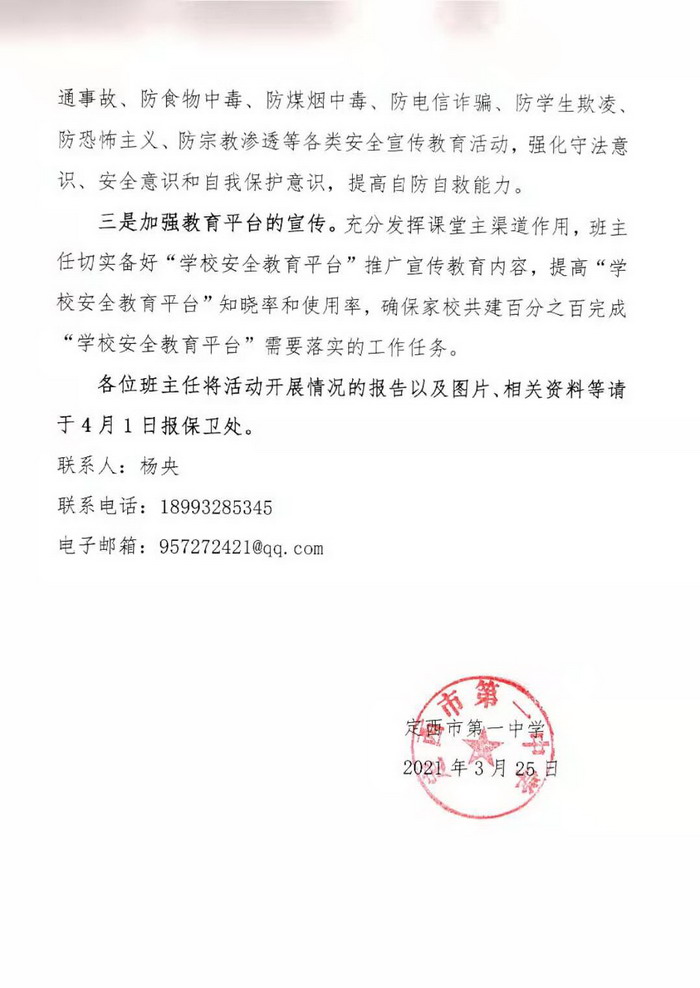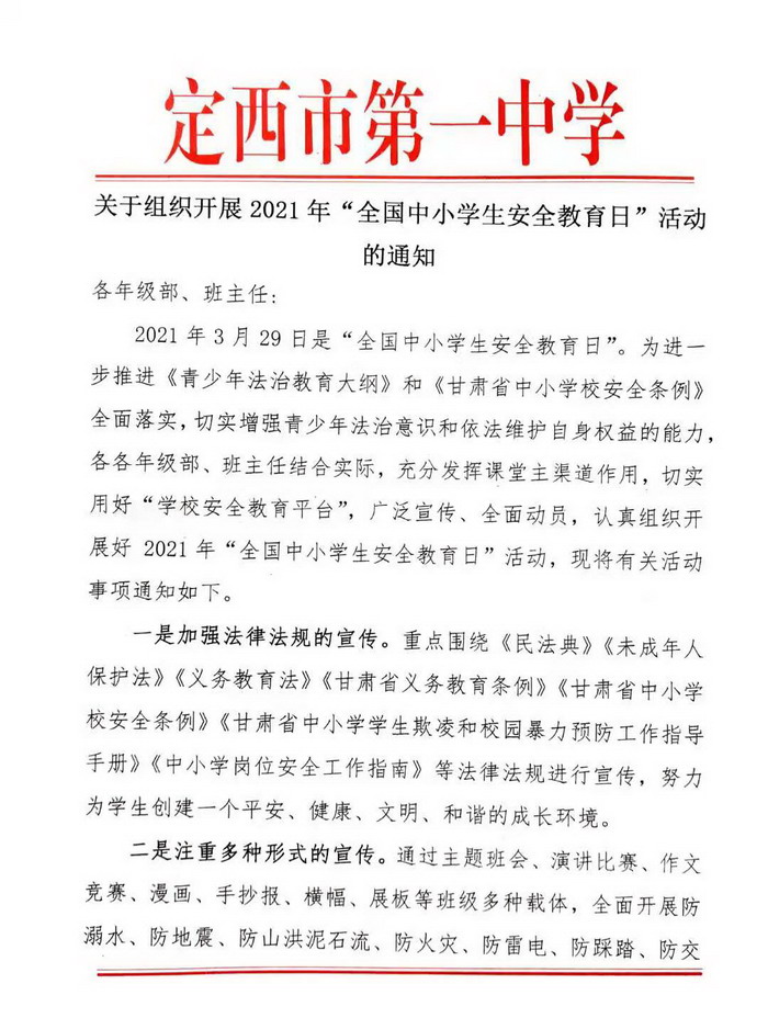 關(guān)于組織開展2021年“全國中小學(xué)生安全教育日”活動(dòng)的通知 時(shí)間:2021-03-29 分類:通知文件 (撰稿人:楊央) 分享: 上一個(gè): 關(guān)于組織開展“上好一節(jié)消防課”主題教育消防安全教育優(yōu)秀課案評選活動(dòng)的通知 下一個(gè): 全國中小學(xué)生安全教育日,26張安全知識大圖送給家長孩子 相關(guān)文章 定西市第一中學(xué)關(guān)于全面加強(qiáng)學(xué)生安全教育致家長的一封信 注冊金鐘罩流程圖 定西市第一中學(xué)關(guān)于組織參加2021年全國青少年禁毒知識競賽活動(dòng)的通知 關(guān)于推廣使用全民消防安全學(xué)習(xí)云平臺的通知 定西市第一中學(xué)守法規(guī)知禮讓安全文明出行活動(dòng)方案 定西市教育局關(guān)于冬季校園安全預(yù)警提示 新聞發(fā)布會(huì)丨甘肅省新冠肺炎疫情防控工作(第二場)情況 新聞發(fā)布會(huì)丨甘肅省新冠肺炎疫情防控工作(第三場)情況
