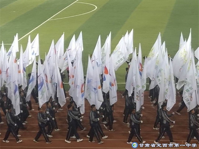 在本屆運(yùn)動會開幕式上,我校200名學(xué)生高舉50面定西市運(yùn)動會會旗、50面定西市第二屆運(yùn)動會會旗、100面紅旗組成方隊入場。他們身著一中校服,帶著蓬勃的朝氣,邁著整齊的步伐,熱情洋溢、英姿勃發(fā)地走過主席臺前,盡顯一中學(xué)子激情、活力、健康向上的精神。
