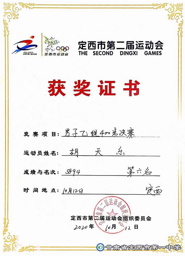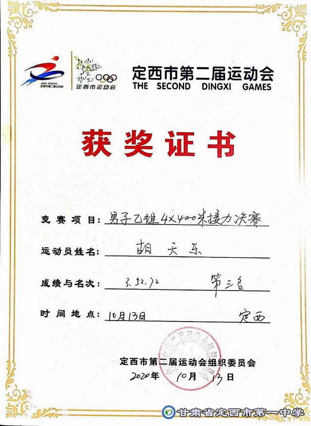 在定西市第二屆運(yùn)動(dòng)會(huì)中,胡天樂(lè)同學(xué)榮獲男子乙組400m決賽第六名以及男子乙組4*400m接力決賽第三名。
