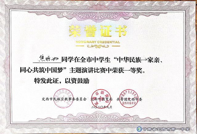 在2020年全市“中華民族一家親、同心共筑中國夢”主題演講比賽中,我校高一明珠班焦爍如同學獲一等獎。