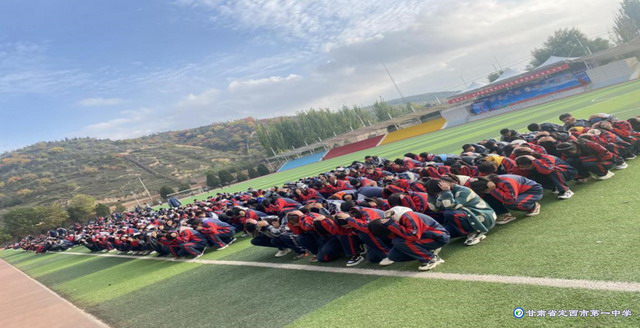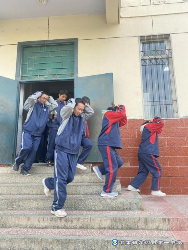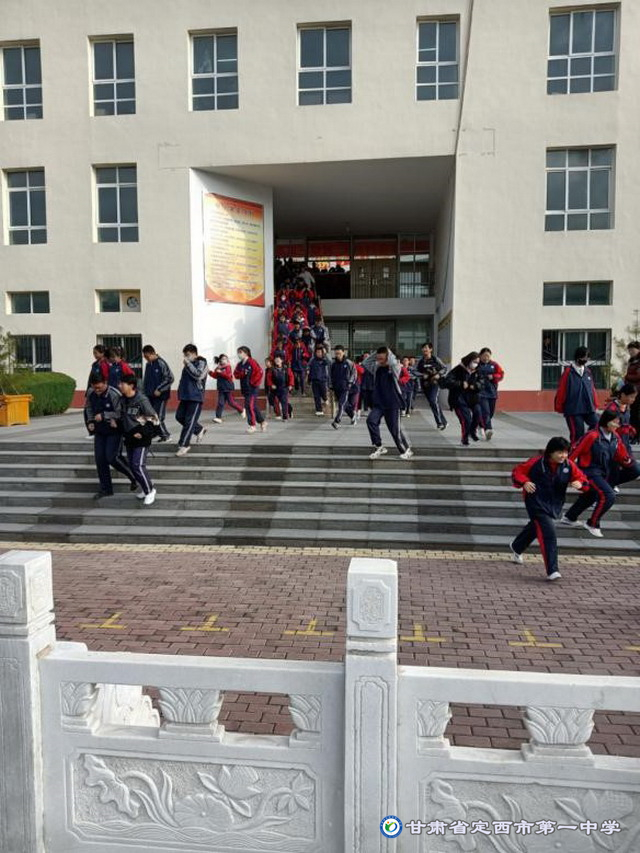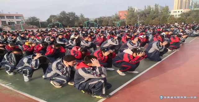 10月20日下午一中的師生們,聽到警報聲后迅速抱頭跑向應急場所在,保護好自己的人身安全。